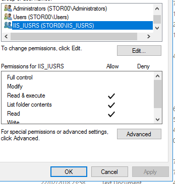 I think the solution adding IIS_IUSRS to in the permission didn't work for us, is because we are using a network share. When I add IIS_IUSRS to the share it is the user of the computer "stor00". This is the server which provides the share, not the user of the server which has the share mounted: