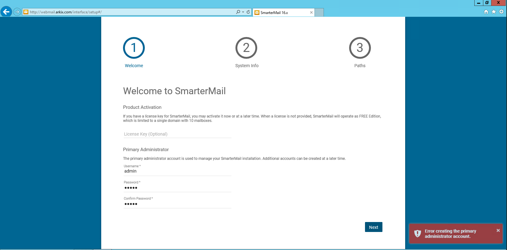 Good moorning, in the following case I need your help, because when configuring web version 16 of smatermail I got an error, saing that it is not possible to create the primary user administrator, however it is an isolated site that has been organized as the migration staging environment.