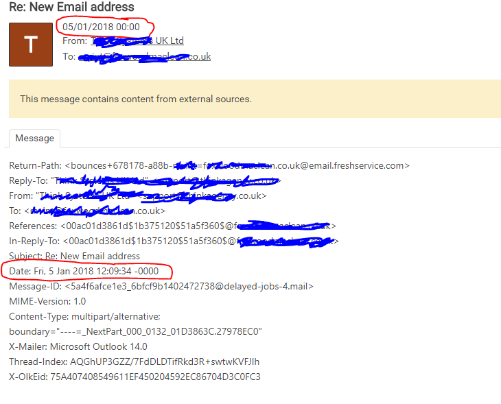 An email is received by someone and the time stamp is set to 00:00 even though in the logs and in message header the right time stamp is showed, cause of this, the email is pushed to the bottom of the pile and is missed half of the type. Has anyone had this issue?