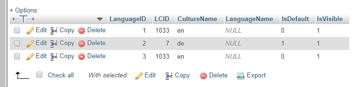 From your description, it sounds like you have the default, generic English language option (en), as well as a culture specific English language option - such as English (United States) which uses the code en-US. In the database, these will both appear with a CultureName of 'en', but the generic one will have a null LanguageName while the UnitedState options would have a LanguageName of 'US'. The generic option is created automatically by SmarterTrack during initial setup, while the culture specific option would have been created by someone with an Administrator role.