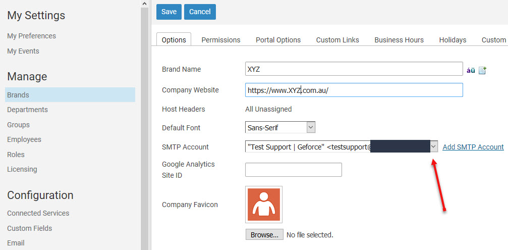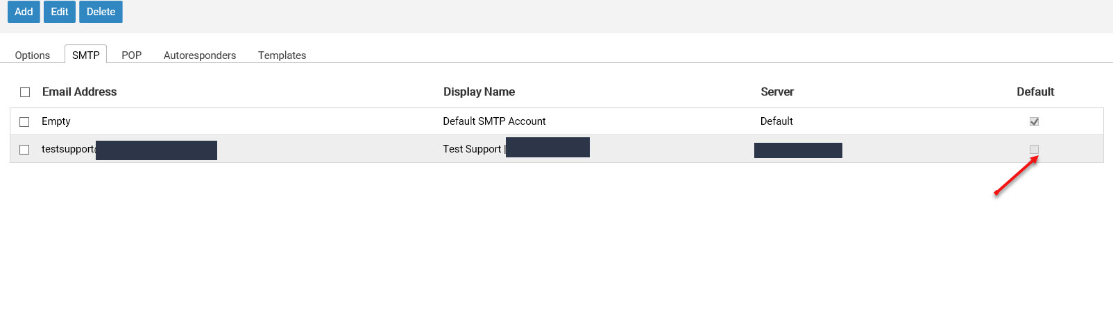 There is currently no way to change which account is the default. Given what is shown in your screen capture, your best approach is to edit the brands you already have set up and modify the SMTP account that is selected there. This will automatically apply to the departments which are configured to use their brand's SMTP account.