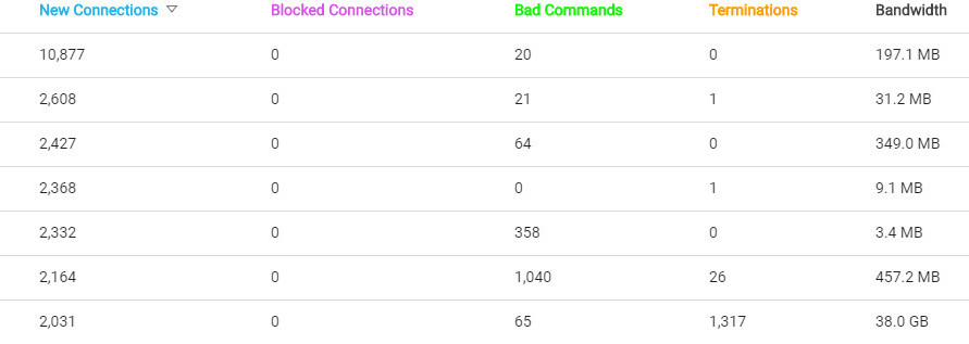 When taking a look at the SMTP-in report, we noticed that one of our domains was receiving leagues above the rest for bandwidth but had no real indication as to why. Consequently they also have the most terminated SMTP-in sessions.