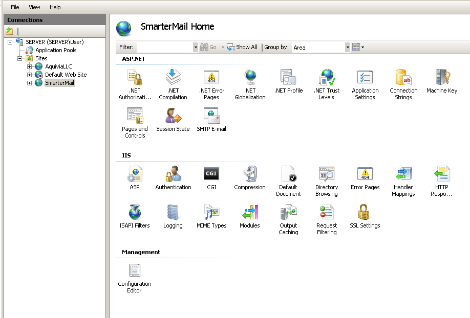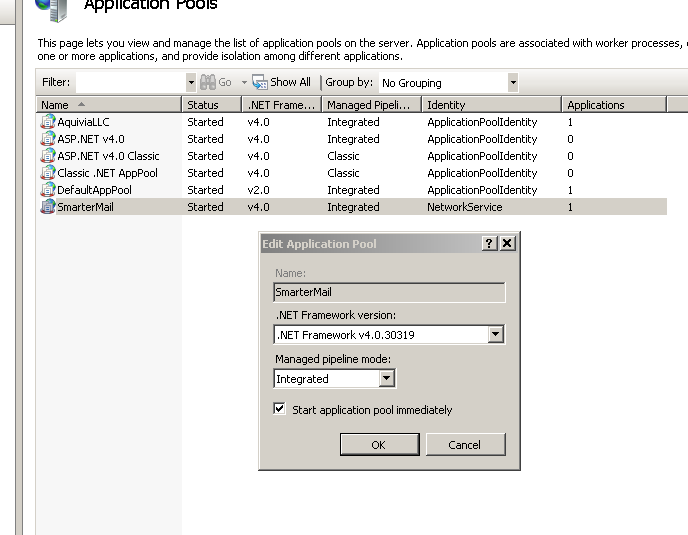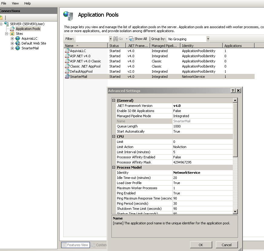 In IIS, I followed the instructions and created an Application Pool and Site: