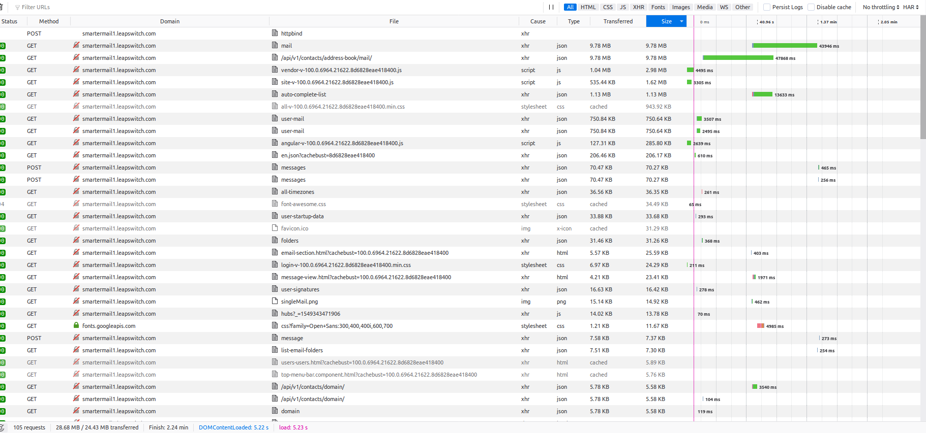 Those address book calls are quite large. How many contacts does the user have? There might be another larger issue with loading those lists, as those are more than 6 times larger in size compared to all the client js,css,etc files.