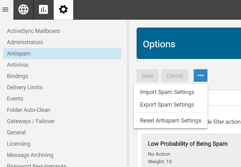 When you log in as the system admin, if you go to Settings > Antispam, on the Options tab you'll see the Actions (...) button. Click that and from the dropdown select Import Spam Settings. You can just drag and drop the JSON file in the modal that opens and SmarterMail will add that new JSON file. Here's a screenshot of what it looks like: