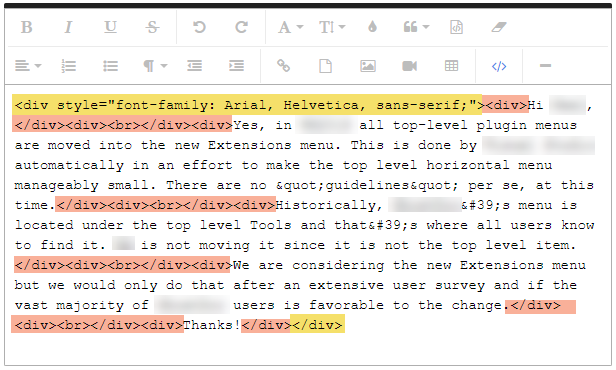 We love the new editor but hate the new Source view. The new Source view is all in one continuos line, no line break, leading spacing nor spaces of any sort - see the screenshot. This is true even when the formatting EXISTED in the original post - it is all gone once you open it with the new editor!