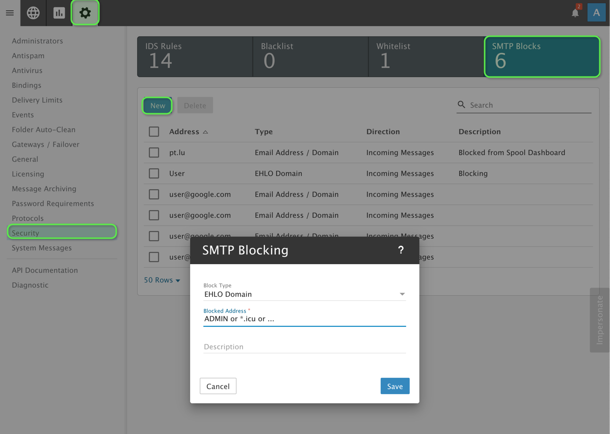 The EHLO command is something that can be blocked. You would do this from the SMTP blocks tab under security.