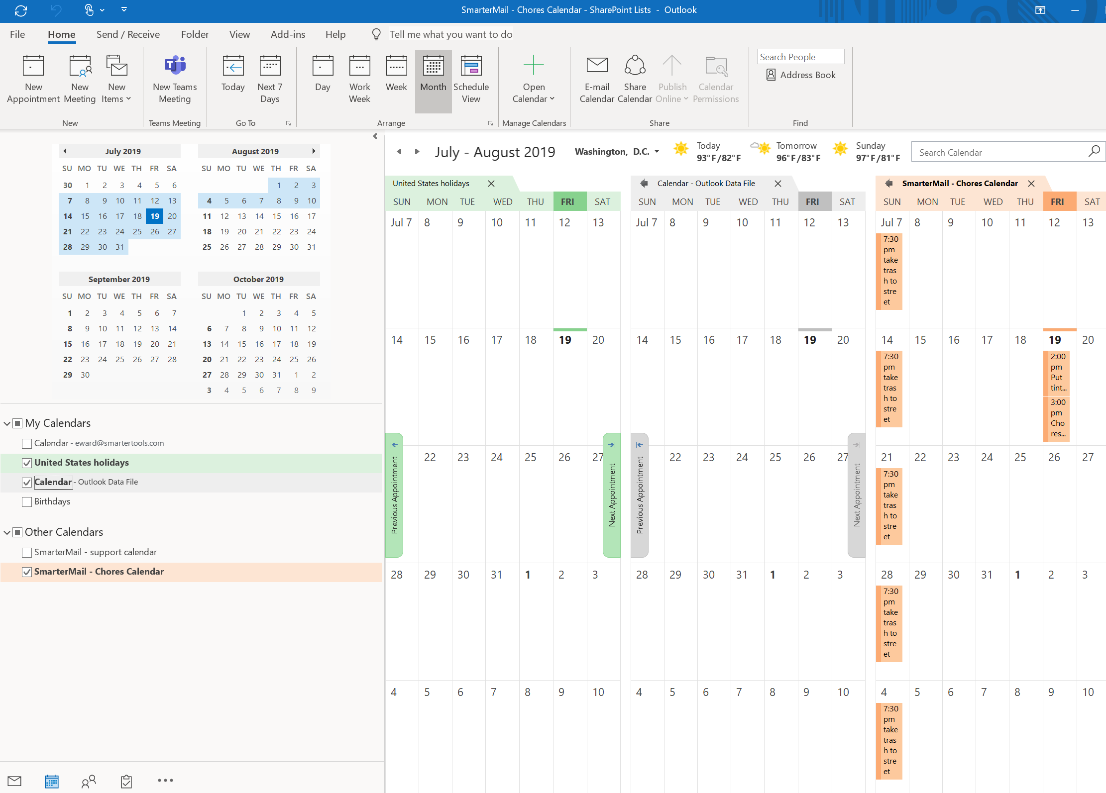 The orange calendar on the far right labeled "SmarterMail-Chores Calendar" was added using Add to Outlook.  Keep in mind this image is from the latest Outlook.  Unfortunately I don't have a copy of Outlook 2007 to provide an image for.  If you would like I can get you a 30 day trial key for the enterprise edition and you can test Add to Outlook in the different versions of Outlook.