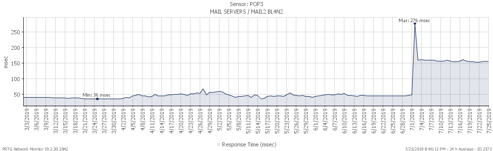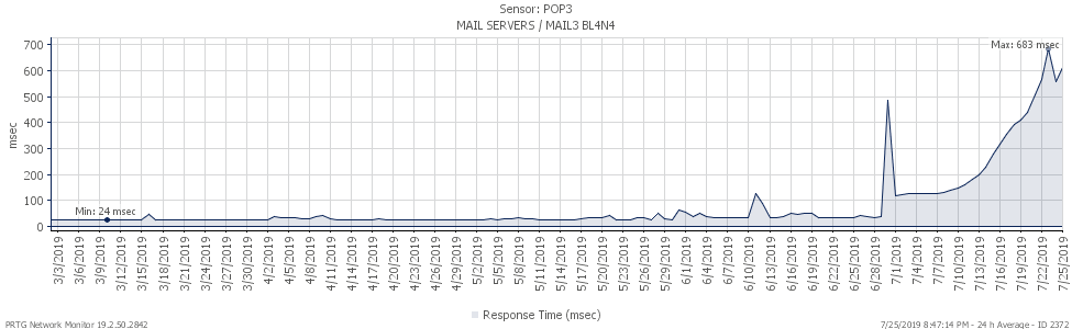 Below are two screenshots of response times for POP services, clearly there is an issue, and you can see it starts immediately after upgrading.
