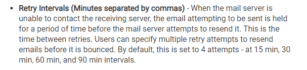 Patrick, these delays are a direct result of the looping issue I just followed up with you on in the other thread. Once you've deployed the minor update (http://www.smartertools.com/downloads/SmarterMail/CustomBuilds/100.0.7172.16219/SmarterMail_7172.exe ), please navigate to Settings>General>Spool and adjust your retry intervals like so:
