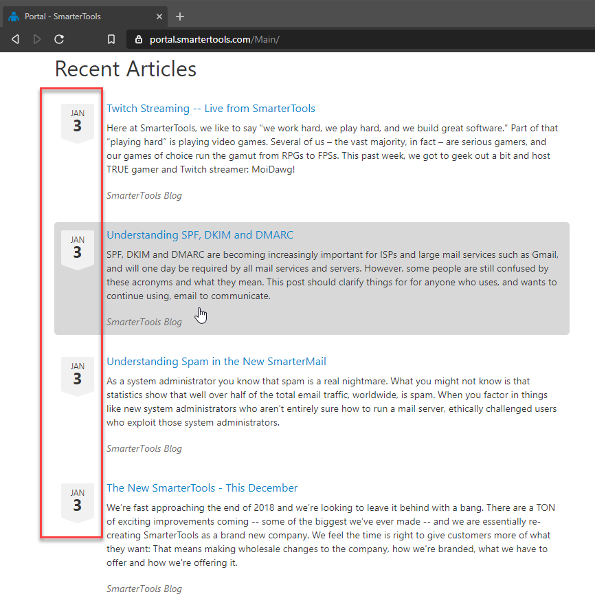 Not an important issue, but just asking if it is a wanted feature that the articles on portal.smartertools.com are all dated from the current day date.