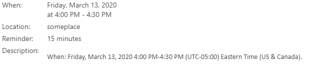 however, the calendar shows the event for 8:00PM to 8:30PM.