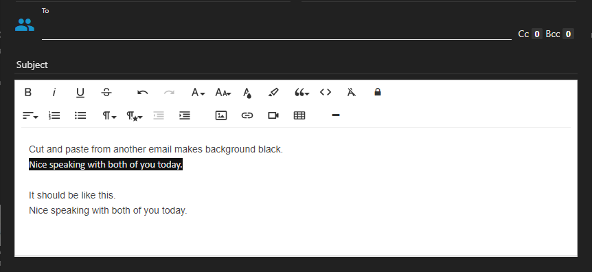 When copying text from another email and pasting it into a new email the text is white with black background. It should be black text on white background.