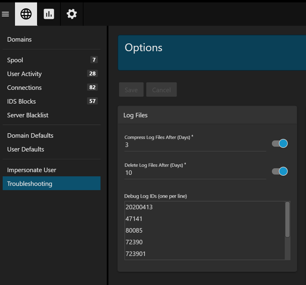 System admin > Manage > Troubleshooting > Options > Debug Log IDs: