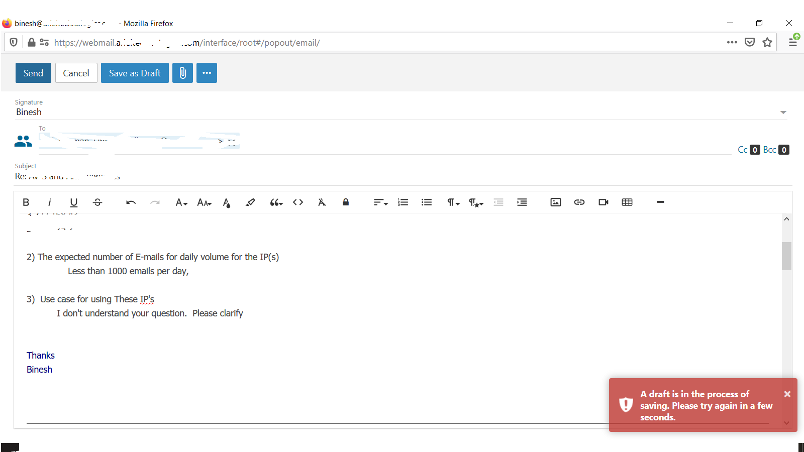 I have received messages that say "draft in process of saving, try again later" when I hit send.  The only way around these messages is to start a new email.