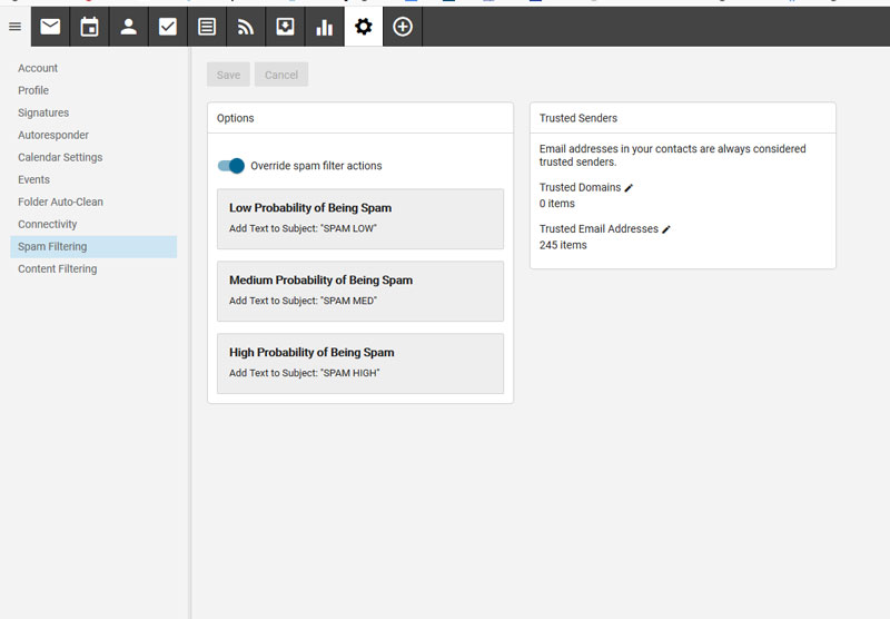 Hi David, I have removed all content filtering other than the internal filter for junk. Should I try to remove that as well? Would it affect all users or just the one I am in. Also, even though I have those set to add the spam high etc to the subject, it does not appear to be doing that in any case. It is just dumping what it believes it to junk into the junk folder.