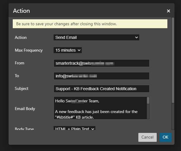 I've checked the logs and found no evidence of an attempt to send a mail after a KB article received a feedback.