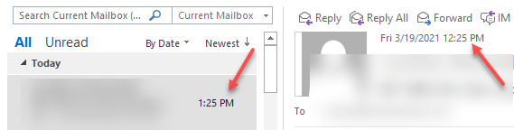 Ever since the time change last weekend, Outlook using POP/IMAP/EAS is displaying the time as an hour ahead on internal emails only. It shows the correct time in the preview pane but the wrong time in the main list view pane as shown below.