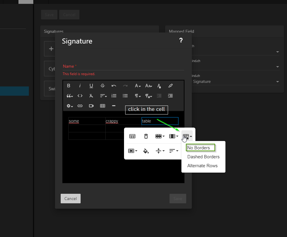We would appreciate that the table layouts are by default out of any borders (especially for people pasting signatures that use tables).