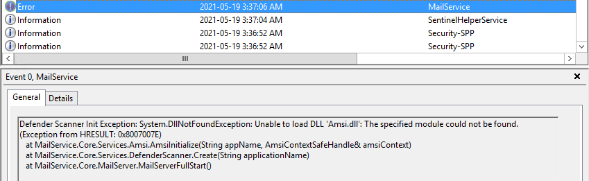 Shaun error's that occur duing FullStart actually appear in the Event log by design, however, this does not mean it stopped the entire process. I'd wager MailService.exe was still running after that message was printed. We've identified the issue, may not actually have anything to do with Defender but we're gonna be testing our build and will release more info once we've had a chance to confirm. Webio's hint at thinking it might be related to domain loading/conversion was on the money, but I'm still trying to wrap my head around how this is related to Defender. We got confirmation that our fix, fixed the test environment.