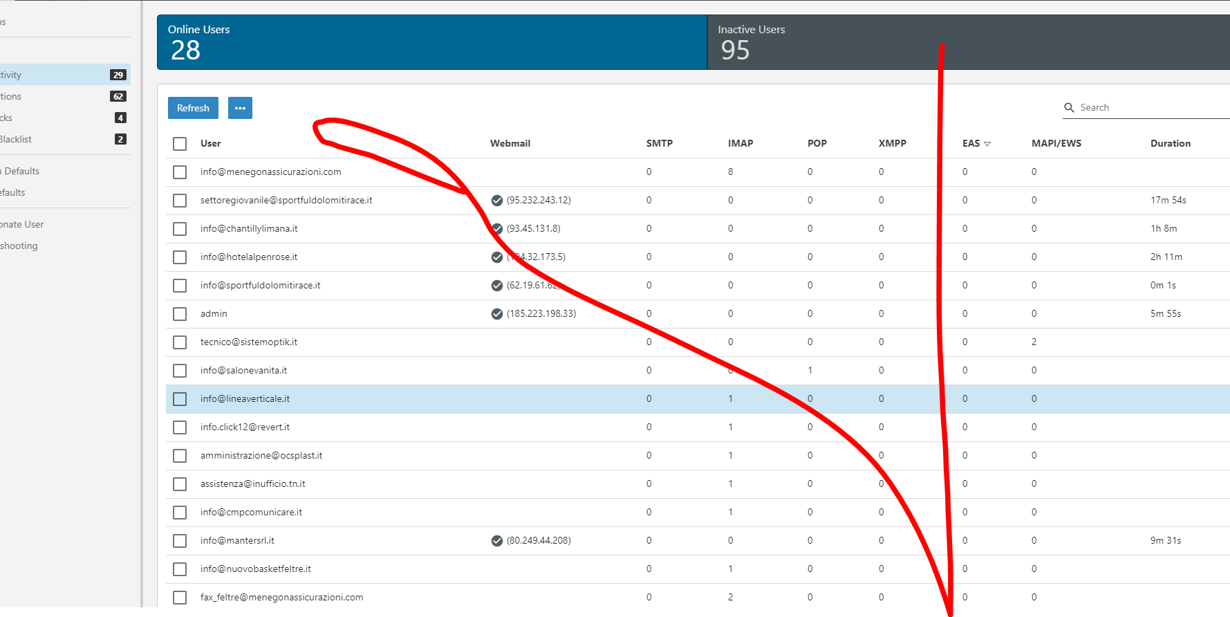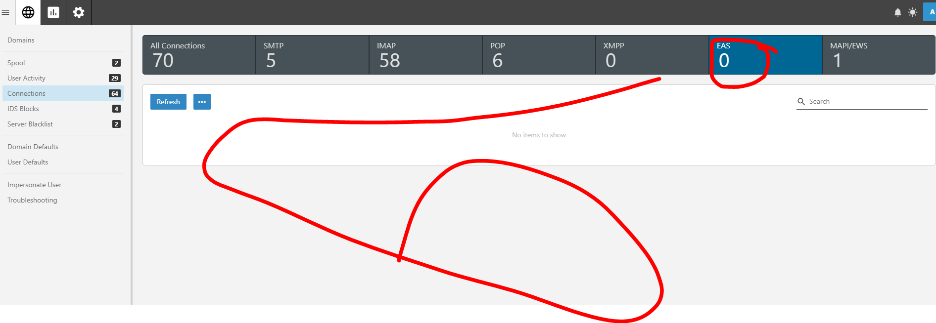 UPDATE: it seems that after a few ours the EAS connections table is updated with the correct number of connections, BUT they show up after a while (several hours) and not immediately as espected.
