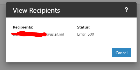[2021.10.29] 09:25:54.551 [5219604] Process delivery status notification step from recipient success. Recipient: [xxxx.yyyy.1.it@us.af.mil], Notify: [success,delay,failure], LastError: [600 ], RanDomainFilter: [False], RanGlobalFilter: False