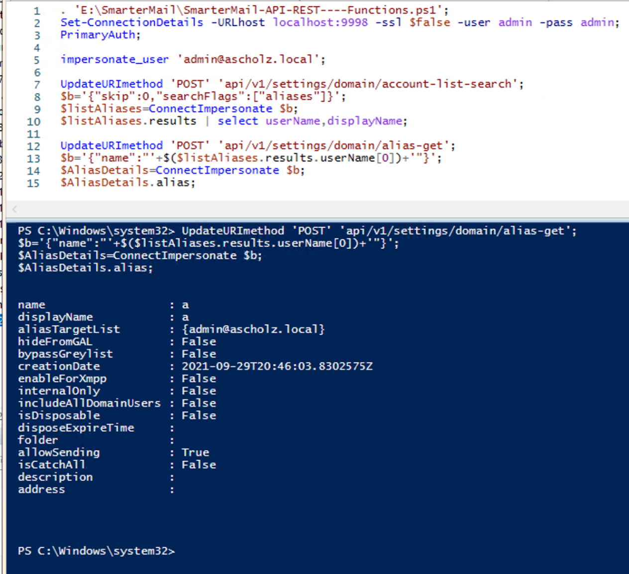 I did a tst of the API to get a list of Alias for a domain as well as the details for a single alias. You can see below that I was able to get the details.
