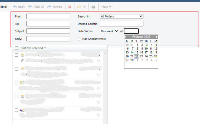 2.) The search accessed by the magnifying glass icon is REALLY clumsy and needs a LOT of mouse clicks. Users really hate it and bitterly complain frequently. They migrated to us from a provider whose search function was supremely intuitive, comprehensive (search all folders or just current) and was simple to enter criteria.