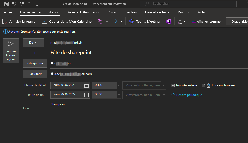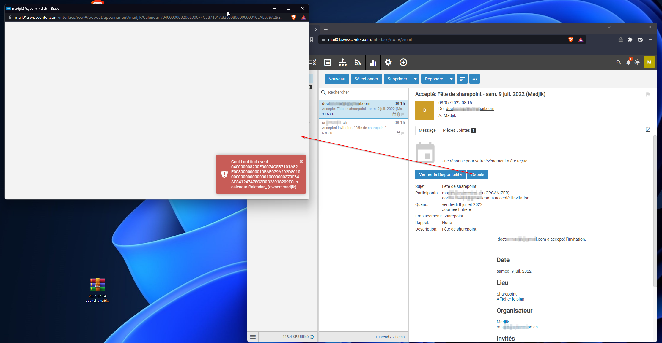 Also when the attendants accept the invitations, the user organiser account receive "Accept" e-mails which is correct. But it doesn't update the status of the attendants in Outlook and from the webmail, if I click on "details" on the accept mails, it says it can't find the event.