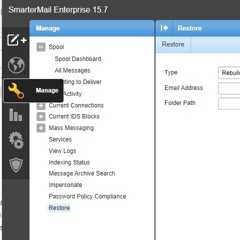 Paul you are looking in the wrong place. You can only do this from the ADMIN account. Click on the Gear Icon (Manage). Then at the bottom of the Manage menu Click on "RESTORE"