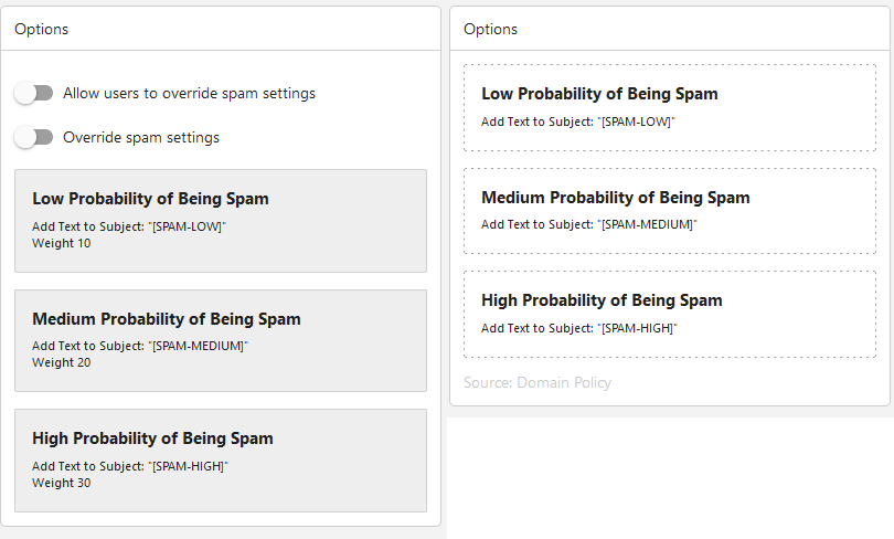 There are no overrides at the user-level. The user shows the same global spam settings when I browse (impersonate) to that user's spam settings. Domain-level content filtering (not spam-check) is also not setup with any rules - there should not be any type of conflict between domain vs spam content filtering. It should be unrelated, but figure this should be mentioned.