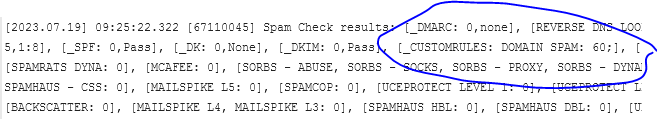 [2023.07.19] 03:24:50.521 [94360025] Spam Check results: [_DMARC: 0,none], [REVERSE DNS LOOKUP: 0,Passed], [NULL SENDER: 0,passed], [_INTERNALSPAMASSASSIN: 2,5:4], [_SPF: 0,Pass], [_DK: 0,None], [_DKIM: 20,None], [UCEPROTECT LEVEL 1: 0], [SPAMRATS SPAM: 0], [UCEPROTECT LEVEL 3: 0], [SPAMHAUS - PBL, SPAMHAUS - SBL, SPAMHAUS - CSS: 0], [SPAMRATS AUTH: 0], [SORBS - ABUSE, SORBS - SOCKS, SORBS - PROXY, SORBS - DYNAMIC IP: 0], [MAILSPIKE L5: 0], [SPAMCOP: 0], [BACKSCATTER: 0], [SPAMHAUS.ORG - XBL: 0], [BARRACUDA: 0], [MCAFEE: 0], [UCEPROTECT LEVEL 2: 0], [MAILSPIKE RBL: 0], [SPAMRATS DYNA: 0], [MAILSPIKE L4, MAILSPIKE L3: 0], [SPAMHAUS HBL: 0], [SPAMHAUS DBL: 0], [URIBL BLACK, URIBL GREY, URIBL RED: 0], [DNSBL: 0], [SURBL: 0], [SEM-URI: 0]