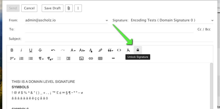 Go to settings -> signatures here you can create a new signature as a draft message. Start a new message and in the top right you can select the signature that you want to use. Once this is set you can click the "Unlock Signature" option in the compose window to edit the draft/signature and send.