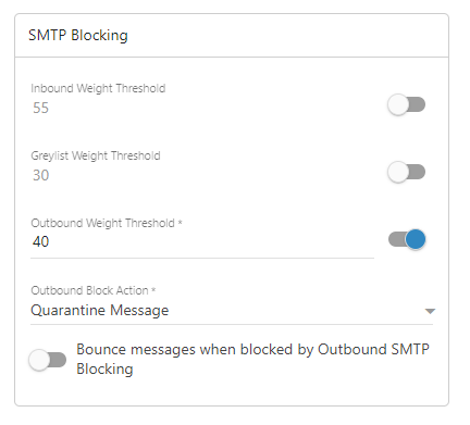 Greylist Weight Threshold - By enabling this field, an inbound email must have a total spam weight score of this value or higher in order to be greylisted. The score is established by the settings on the Spam Checks, RBLs and URIBLs tabs. (By default, this threshold is set to 30 and is disabled.)