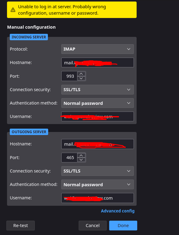 I setup an Nginx proxy server to provide SMTP/POP/IMAP authentication to upsteam servers either on Smartermail or cPanel. I am able to get SMTP/POP working on both Smartermail and cPanel, however, I aways get "unable to log in at server, Probably wrong configuration, username and password" when testing IMAP with or without SSL in Thurderbird. At soon as I switch upstream server to cPanel, the same IMAP config works just fine.