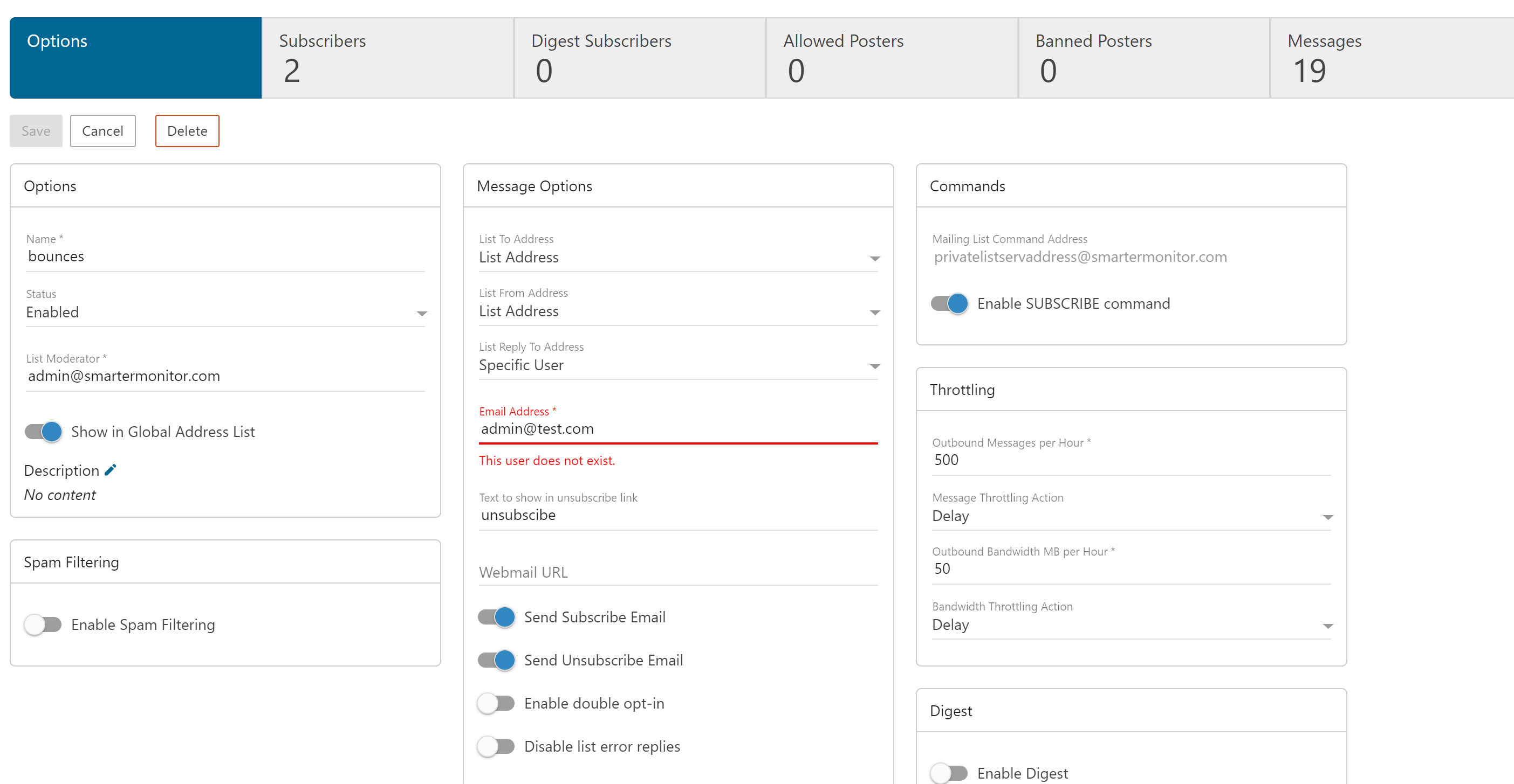 If you click on the mailing list from within webmail, you'll see the following settings: