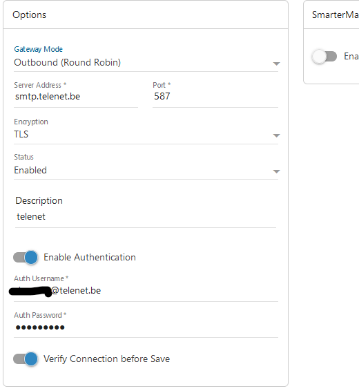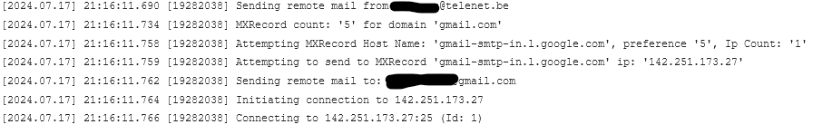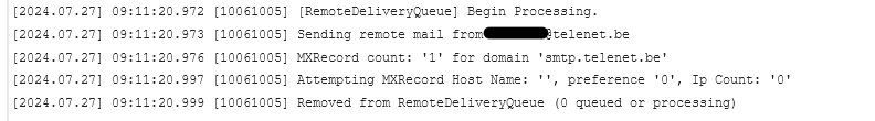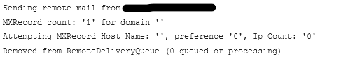 The issue I am seeing here is that the domain is missing (MXRecord count: '1' for domain ''). What version are you running? We released a fix for a similar issue several months back.