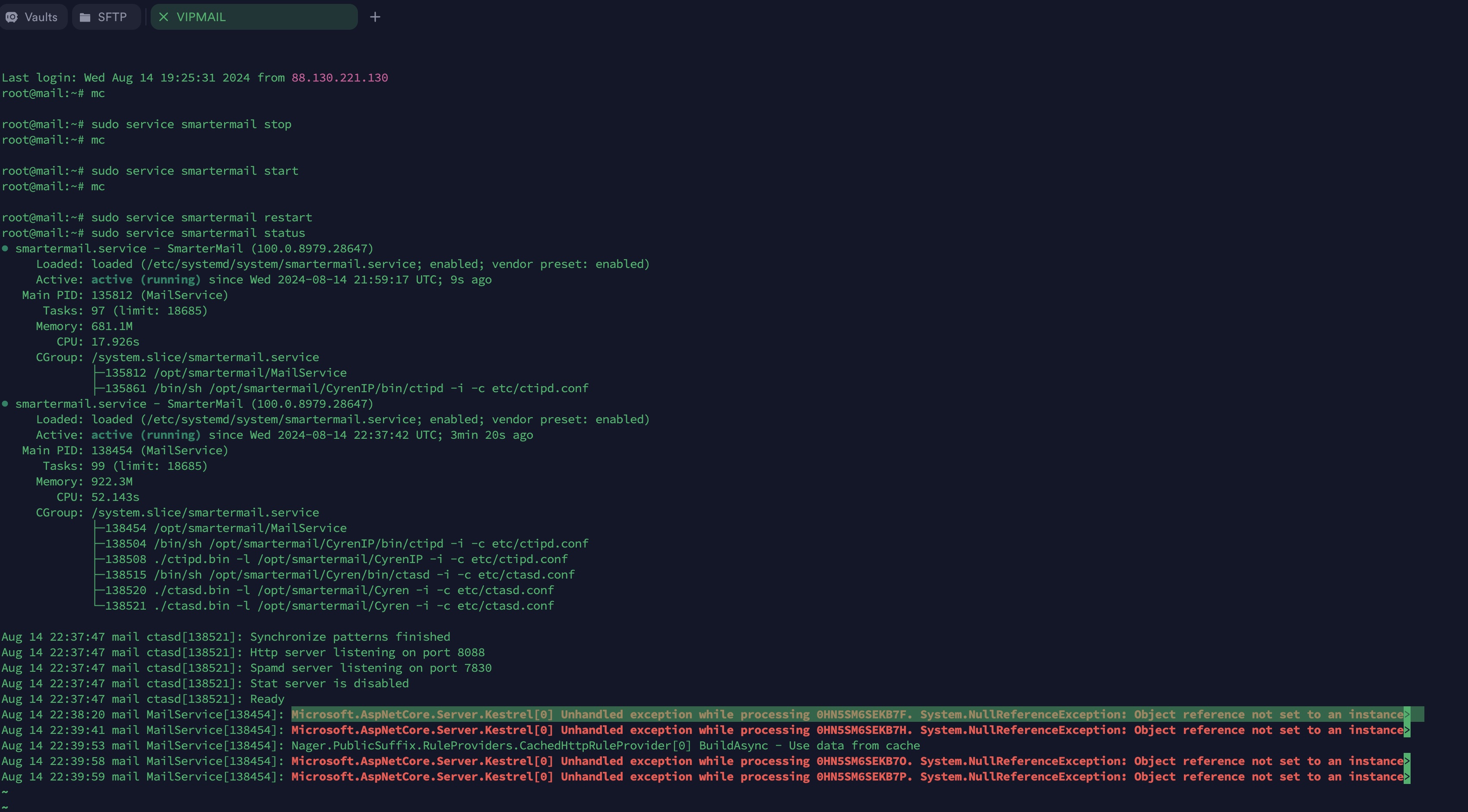 Aug 11 14:39:26 mail MailService[15024]: Microsoft.Hosting.Lifetime[0] Application started. Hosting environment: Production; Content root path: /opt/smartermail