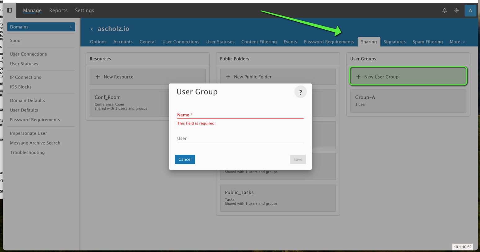 To create a group please go to manage -> domains -> {domain_name} -> sharing [tab]. Here you will see an option for "Groups".