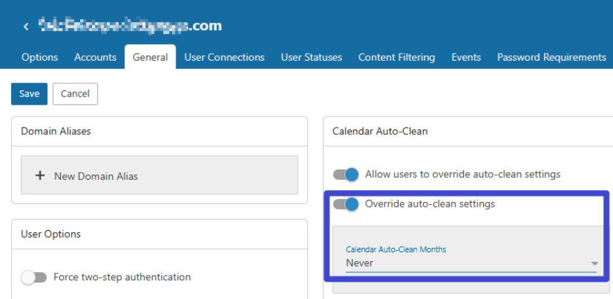 You can find the option for allowing users to override the domains default auto-clean configuration by going to Manage > Domain > General - Calendar Auto-Clean > Allow users to override Auto-Clean Settings. You can also make changes to the default auto-clean configuration for a given domain in the same section by toggling the option "Override auto-clean settings".