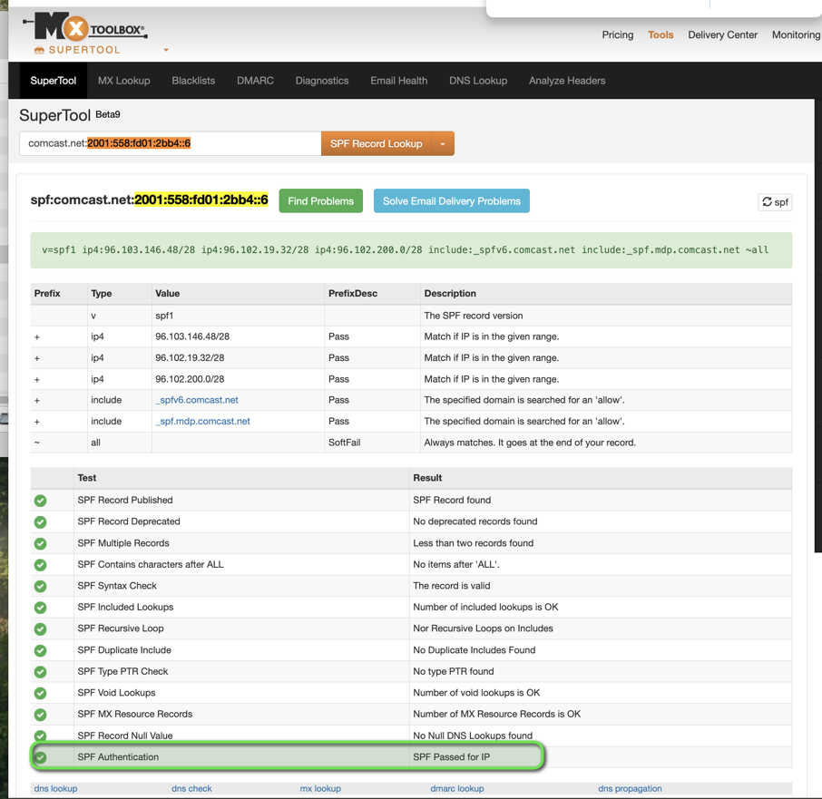 Doing an SPF lookup on spf.comcast.net returns an empty string. Try including comcast.net. This looks to include that IPv6 address in your DMARC report.