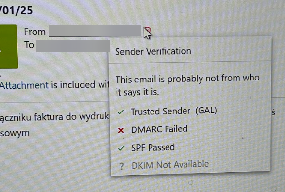 additionally Trusted Sender is marked as "green" because this spoofed email address is on clients mailbox contact list so it is Trusted right....?