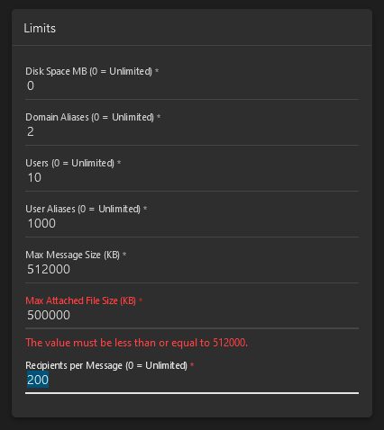 - Max Attached File Size (KB) - The maximum size of attachments, regardless of type, to NON-email related areas such as calendars, tasks, notes, signatures, etc. This is because the Max Message Size limit already calculates attachment size for email messages.