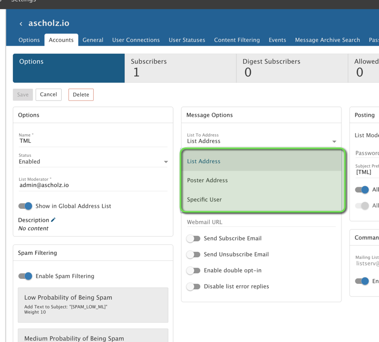 • List From Address - The email address that will display in the From field when a subscriber receives a mailing list message. By default, this is set to List Address. However, the email address of the person who posts to the list can be used, or each message to list subscribers can come from a specific user.