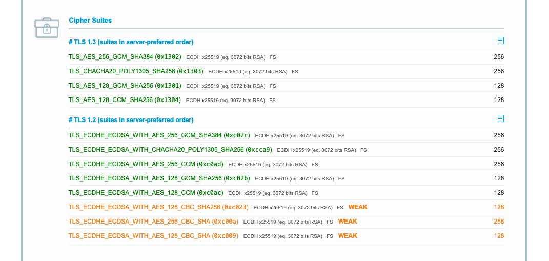 As to the cipher-suite details, I think all of that tuning needs to occur at the operating system level. More detailed questions should be a support ticket.
