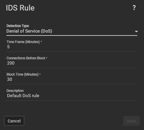 [2026.02.17] 07:09:02.307 DenialOfService [DenialOfService w.x.y.z] Added IP to IDS block list. Duration: 1799,9980358 seconds, Description: Default DoS rule