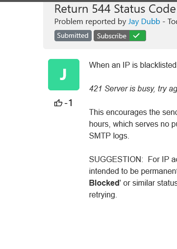 SUGGESTION:  For IP addresses that have been admin-added to the Blacklist and intended to be permanent, return a '544 - IP Rejected' or '550 5.7.1 - Sending IP is Blocked' or similar status code to create a hard-failure that stops the sender from retrying.