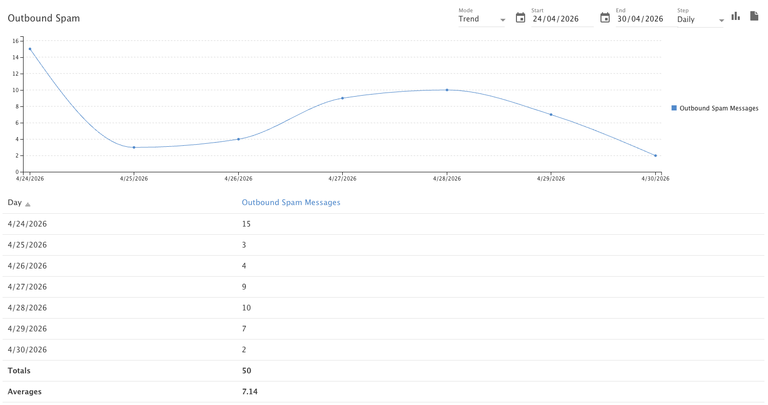 I'm trying to find out which domain/account is sending outgoing spam, but, my main screen shows 50 outgoing spam, for the "Trend". When i click domain, this then shows 1 for the domain, so this tells me, I assume, that it's this domain that's sending the spam?