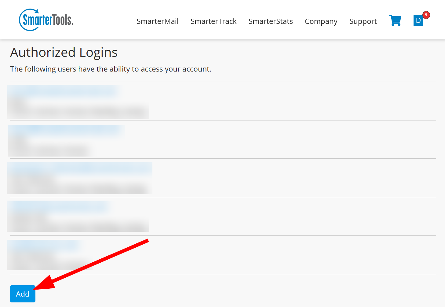 How do I manage my customer account?SmarterTools customers can manage their account by visiting the SmarterTools website and clicking on the account icon in the upper right. From there, customers can log in and access their account to modify mailing list subscriptions, update contact information, view and pay invoices, and more. (NOTE: This is ONLY your account with SmarterTools.com, which would have been created if you purchased a license or service directly from us. It has nothing to do with a SmarterMail email account or other account within a product or service created and sold by SmarterTools that you may have received from a third-party or service provider.)How do I provide customer account access to multiple people in my company?Because there might be instances in which multiple people need to log in to the same customer account to pay invoices, order new products/support or manage licensing information, SmarterTools allows the primary account holder to create additional logins. Follow these steps to create a new Authorized Login: